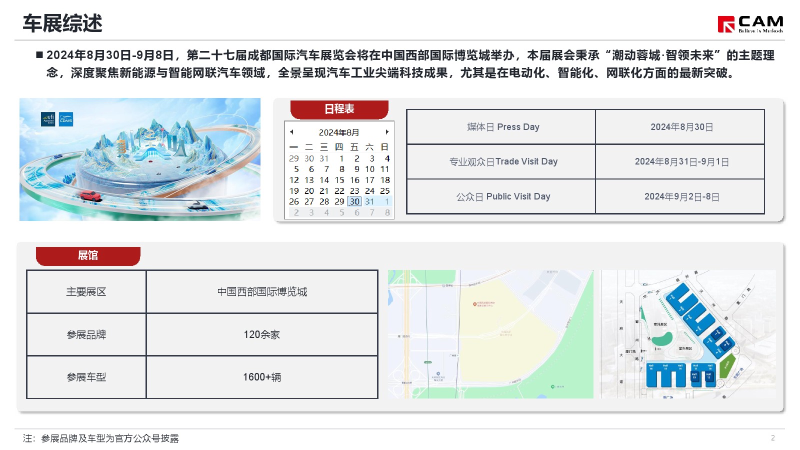 : 车展综述2024年8月30日-9月8日,第二十七届成都国际汽车展览会将在中国西部国际博览城举办,本届展会秉承“潮动蓉城·智领未来”的主题理念,深度聚焦新能源与智能网联汽车领域,全景呈现汽车工业尖端科技成果,尤其 ...