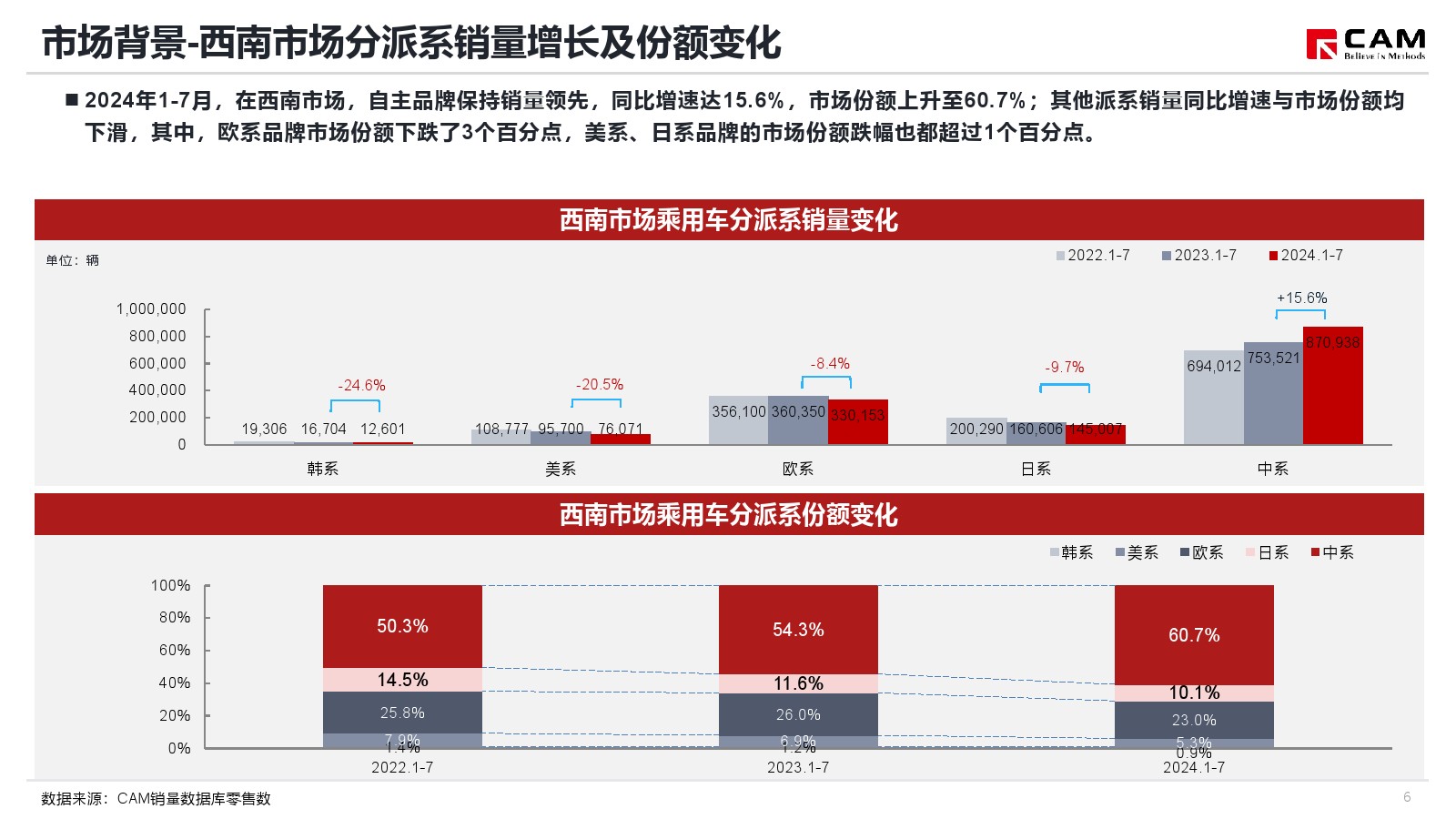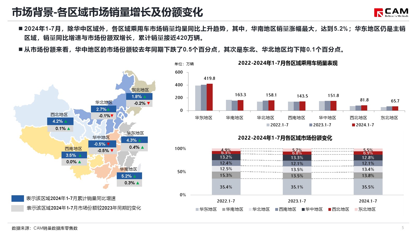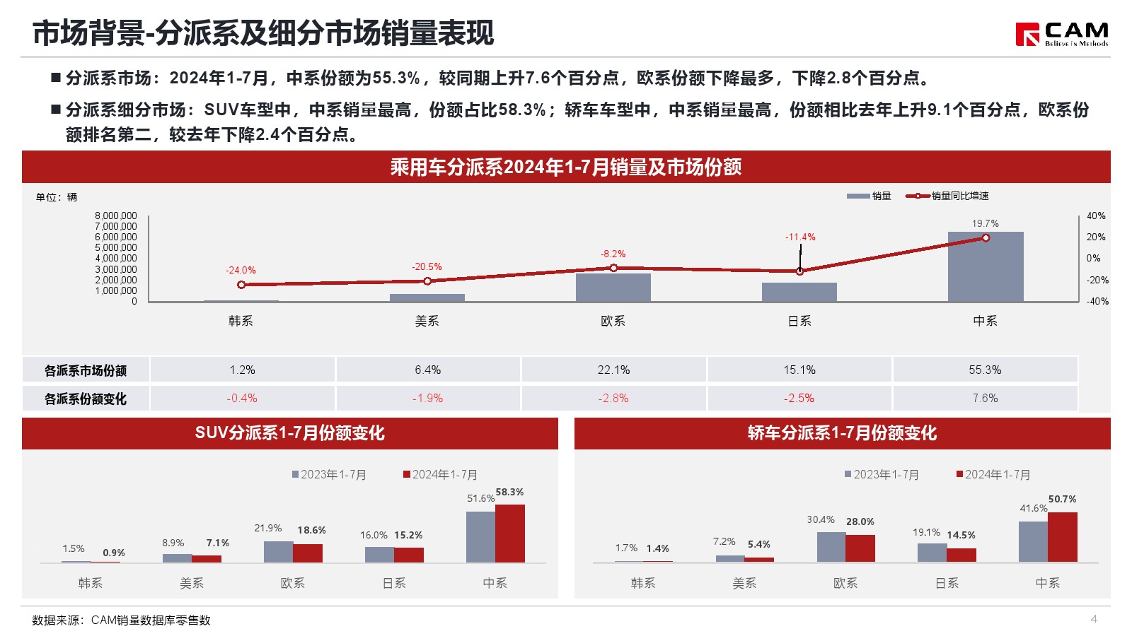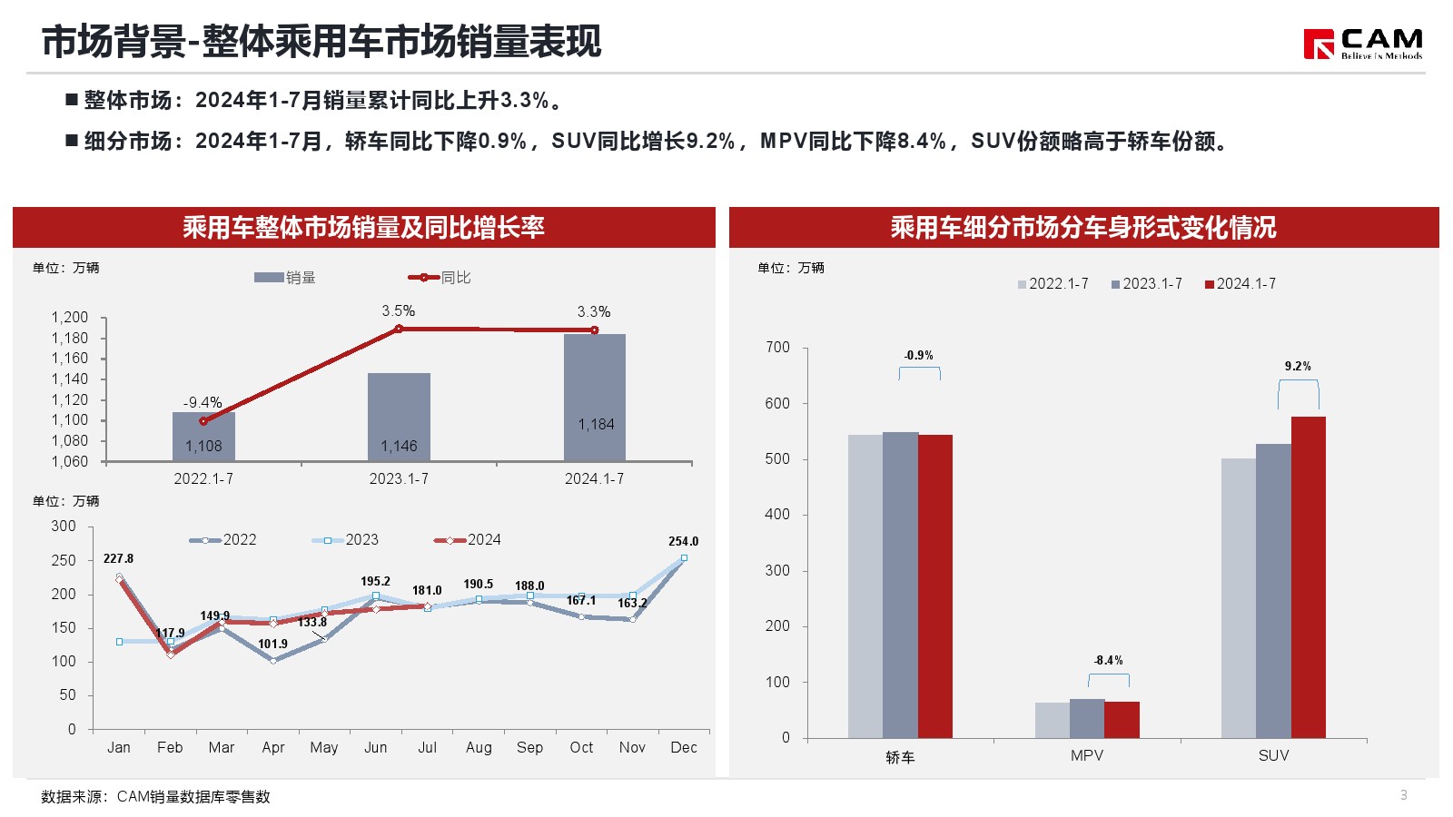 市场背景-整体乘用车市场销量表现整体市场:2024年1-7月销量累计同比上升3.3%。