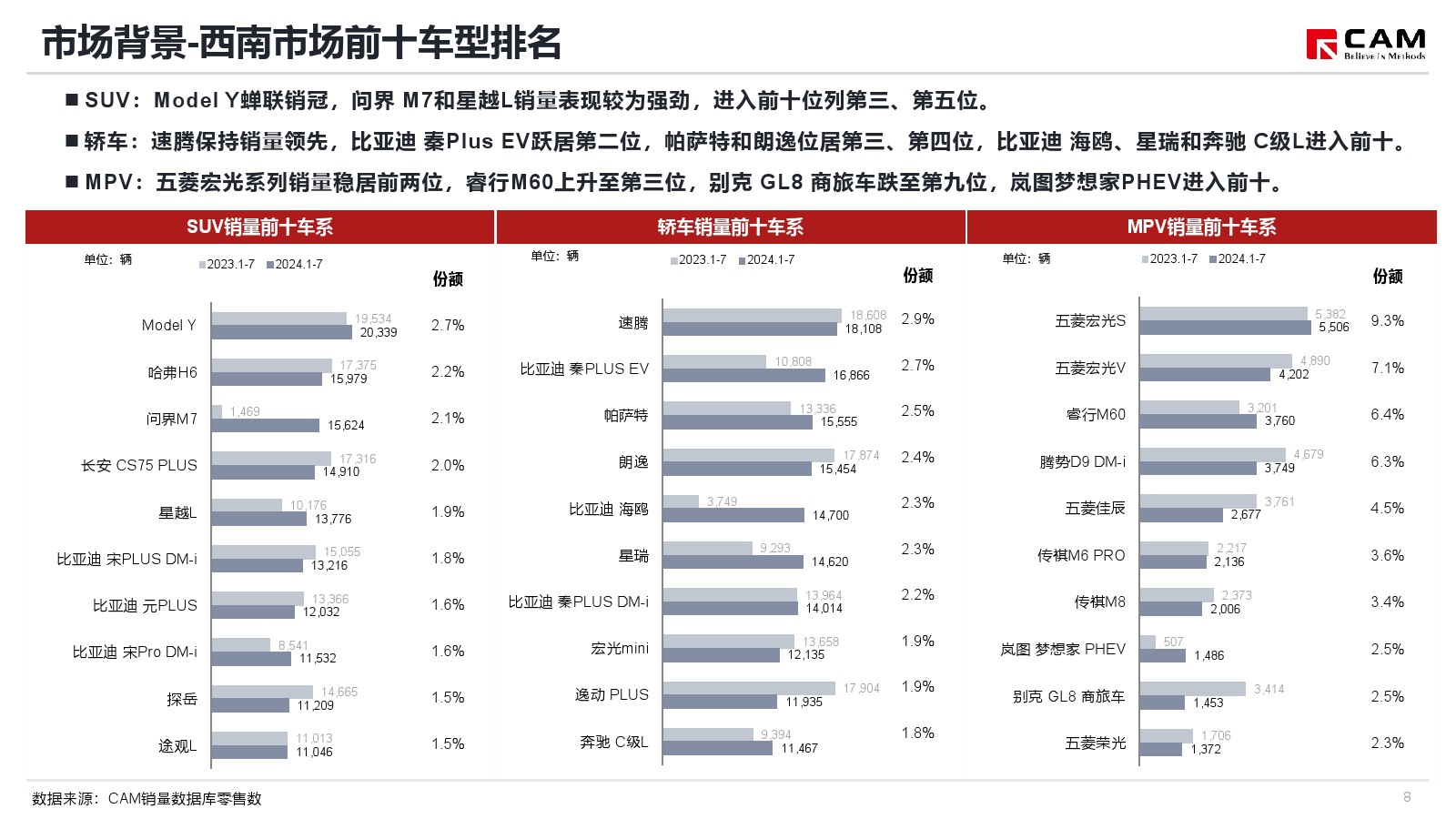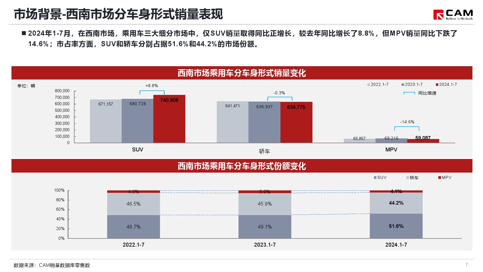细分市场:2024年1-7月,轿车同比下降0.9%,SUV同比增长9.2%,MPV同比下降8.4%,SUV份额略高于轿车份额。