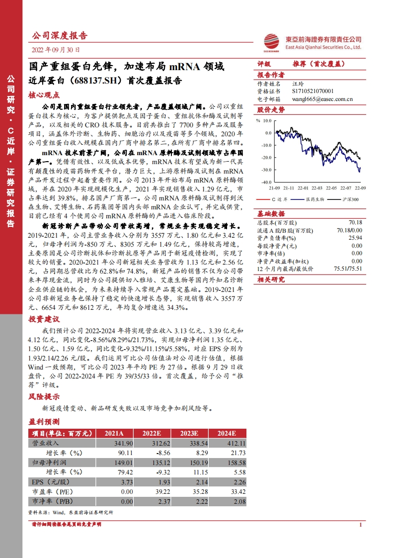 2022-09-30-东亚前海证券-近岸蛋白-首次覆盖报告:国产重组蛋白先锋,加速布局mRNA领域