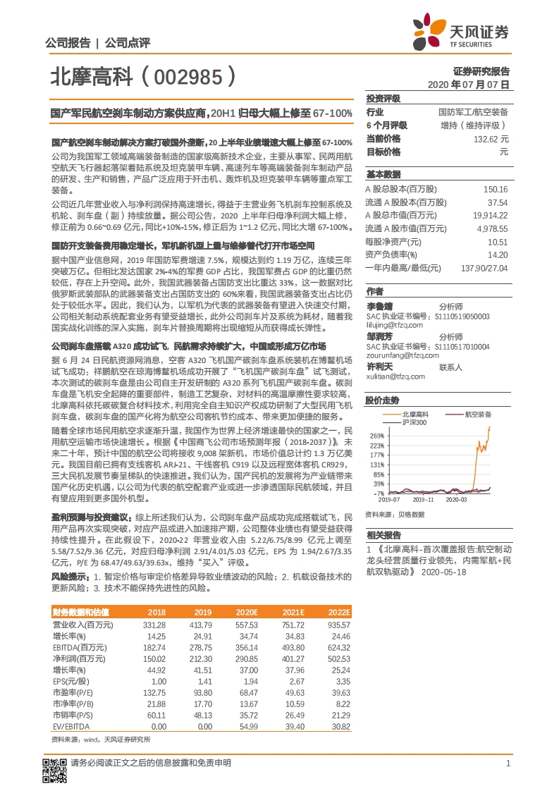 2020-07-07-天风证券-北摩高科-国产军民航空刹车制动方案供应商,20H1归母大幅上修至67-100%