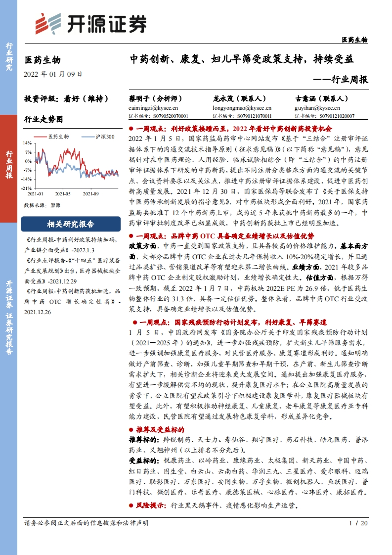 医药生物行业周报:中药创新、康复、妇儿早筛受政策支持,持续受益
