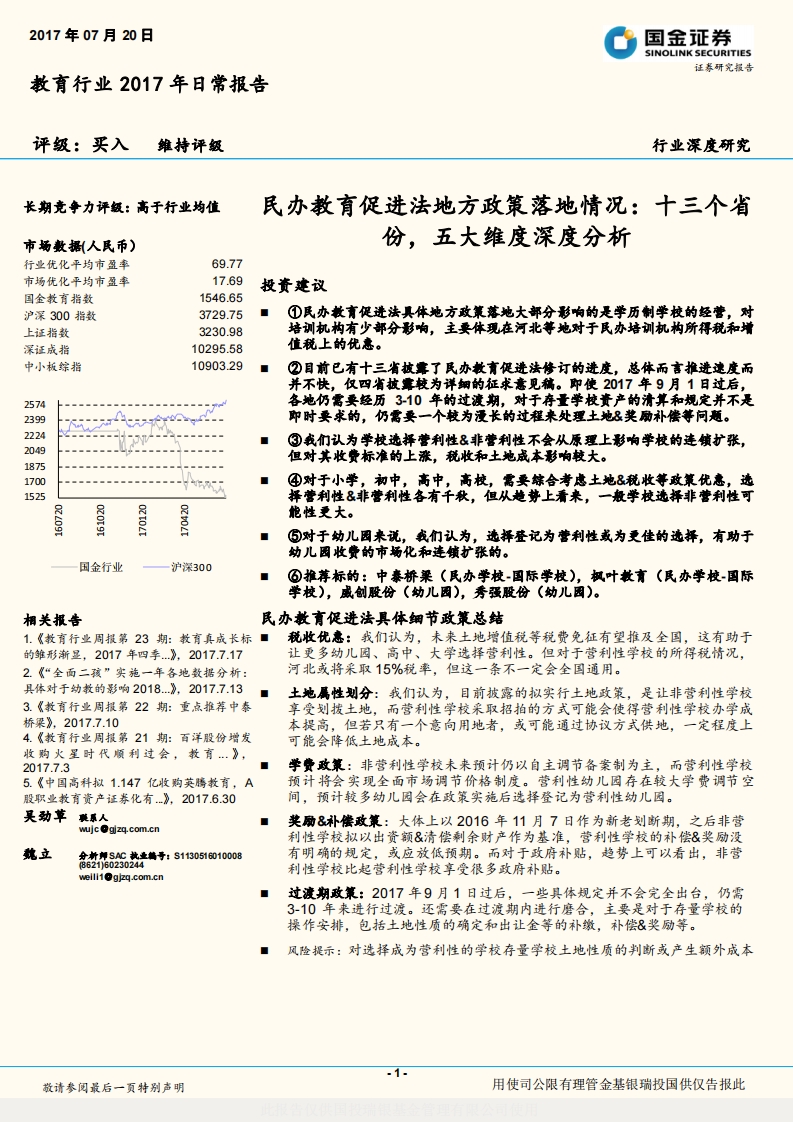 教育行业2017年日常报告:民办教育促进法地方政策落地情况:十三个省份,五大维度深度分析