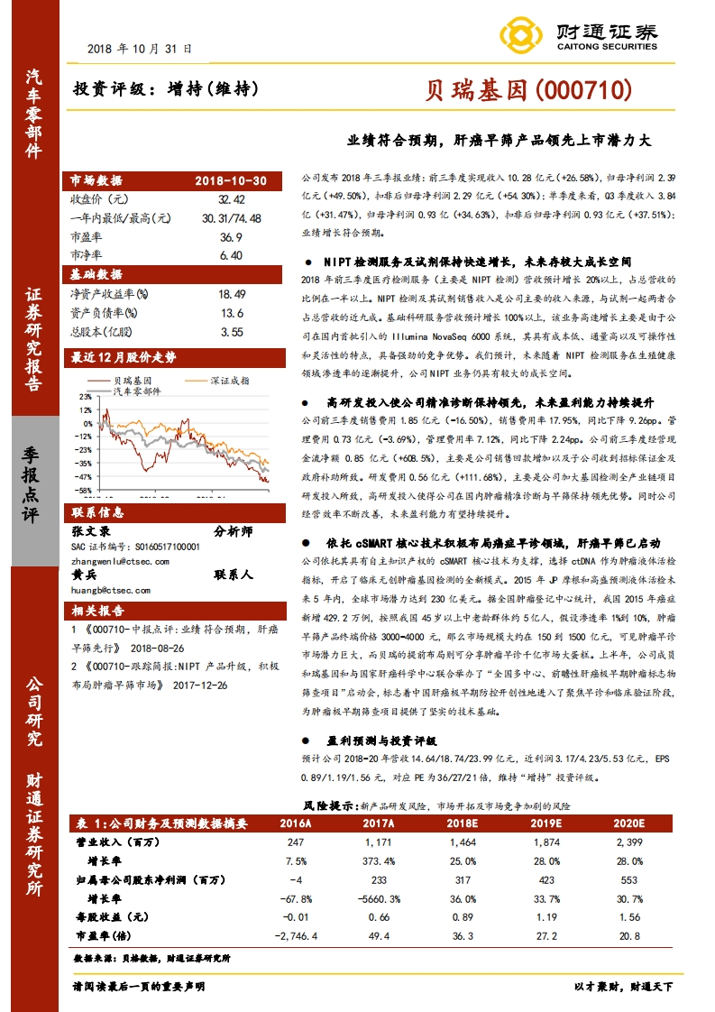 2018-11-02-财通证券-贝瑞基因-业绩符合预期,肝癌早筛产品领先上市潜力大