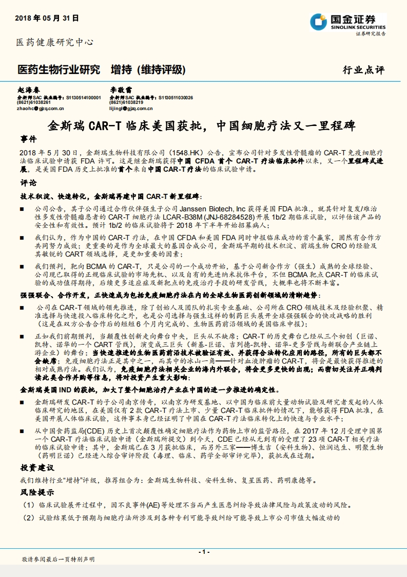医药生物行业研究:金斯瑞CAR-T临床美国获批,中国细胞疗法又一里程碑