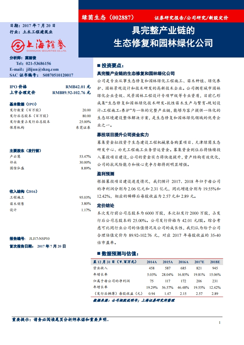 新股定价:具完整产业链的生态修复和园林绿化公司