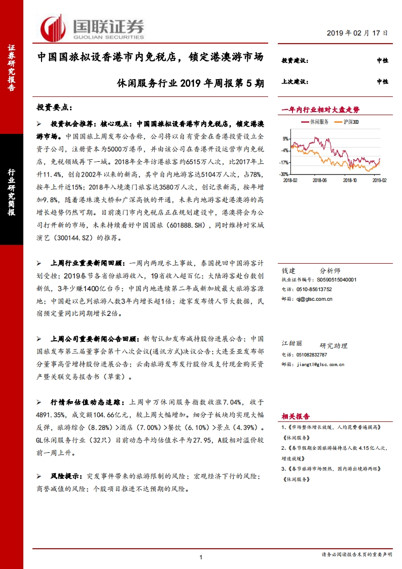 休闲服务行业2019年周报第5期:中国国旅拟设香港市内免税店,锁定港澳游市场