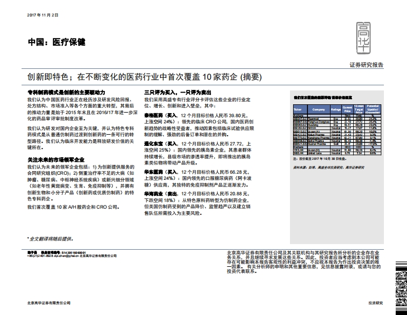 中国:医疗保健:创新即特色;在不断变化的医药行业中首次覆盖10家药企(摘要)