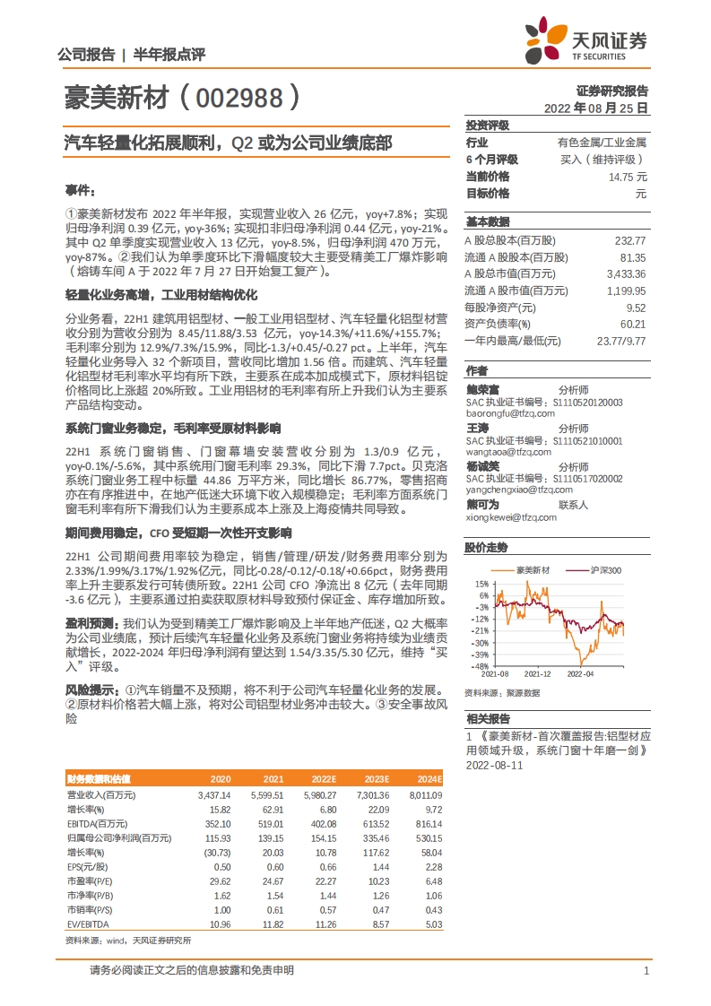 2022-08-26-天风证券-豪美新材-汽车轻量化拓展顺利,Q2或为公司业绩底部