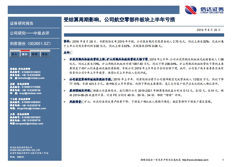 20190829-信达证券:利君股份-受结算周期影响,公司航空零部件板块上半年亏损-5页