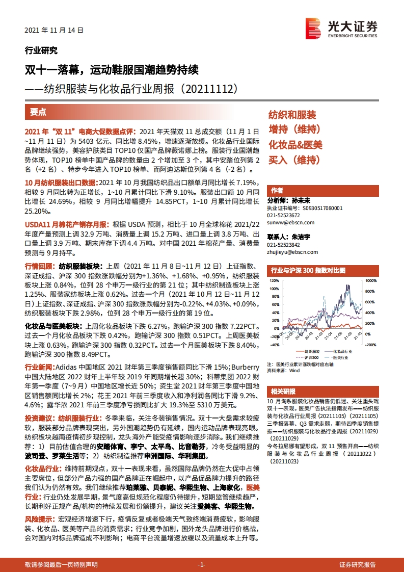 纺织服装与化妆品行业周报:双十一落幕,运动鞋服国潮趋势持续
