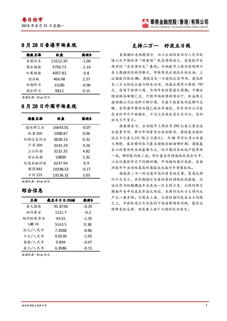 2015-华泰证券:-华泰金融香港-每日论市-支持二万一,好淡五日线-3页