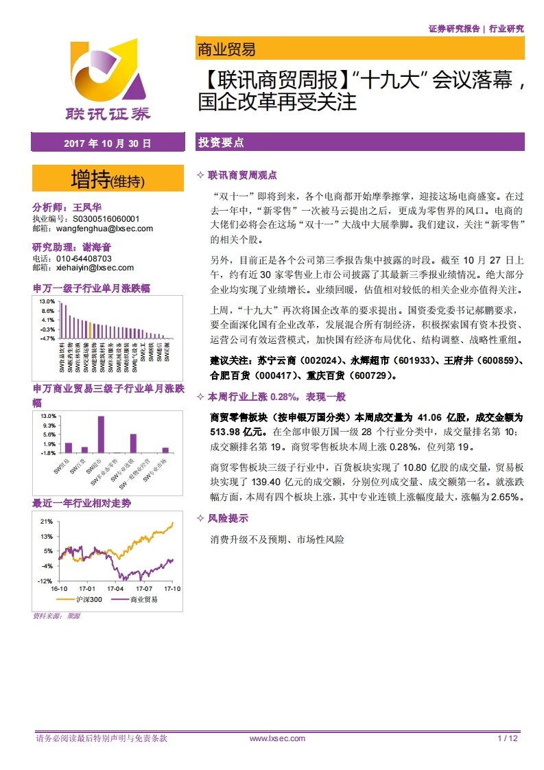 【联讯商贸周报】“十九大”会议落幕,国企改革再受关注