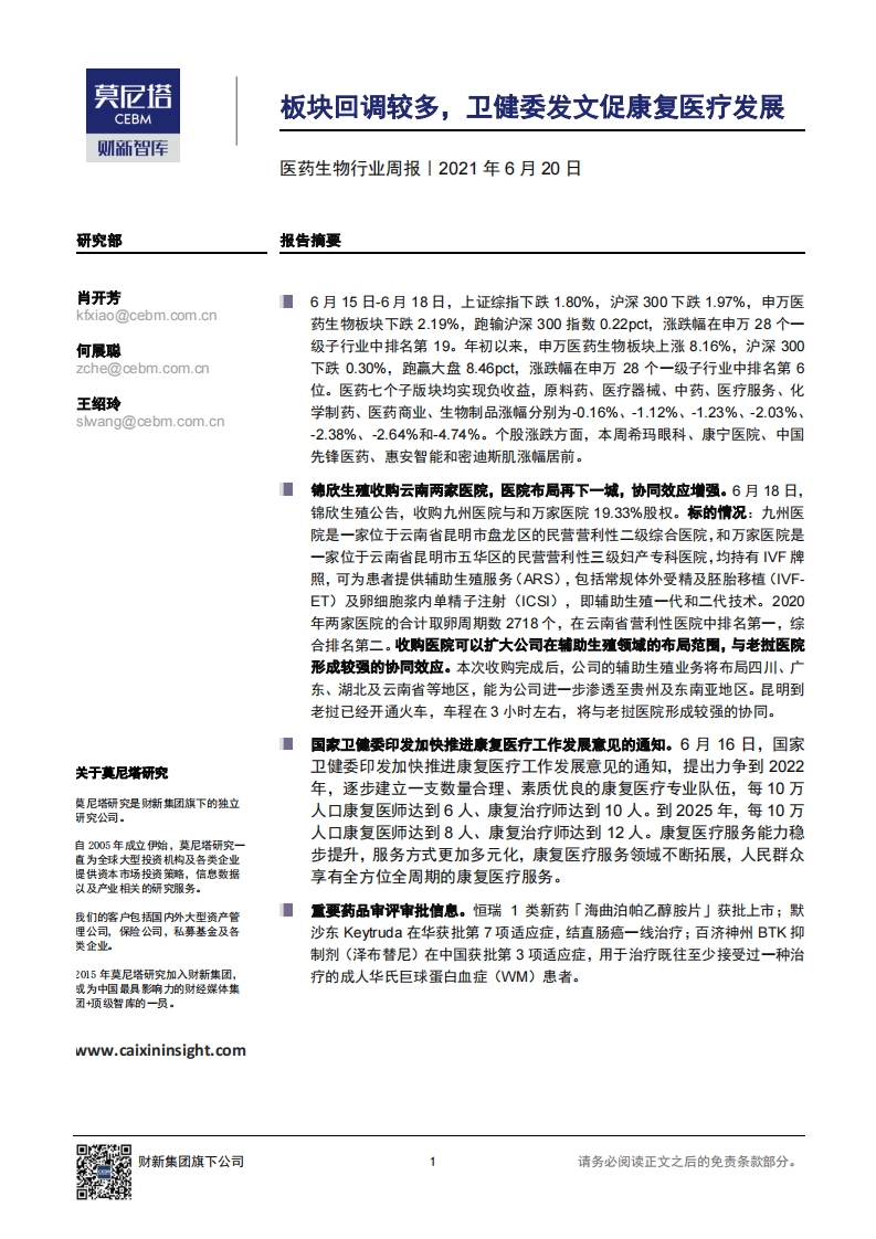 医药生物行业周报:板块回调较多,卫健委发文促康复医疗发展