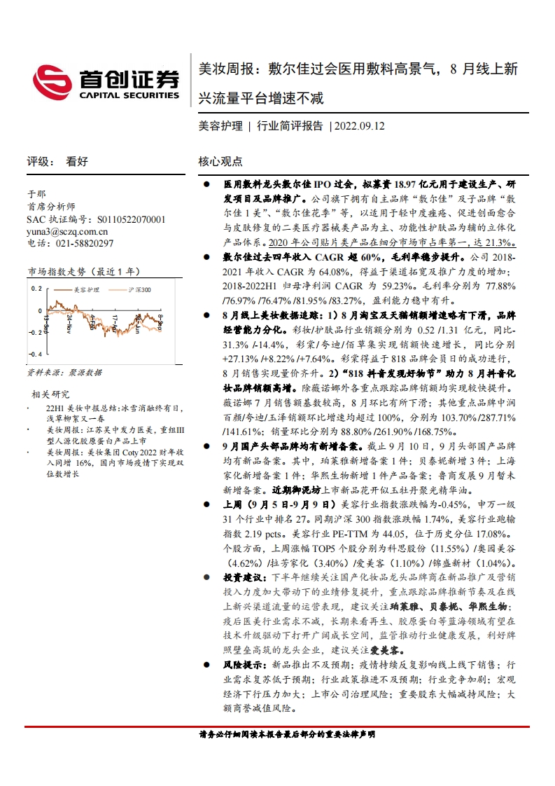 2022-09-13-首创证券-美妆周报:敷尔佳过会医用敷料高景气,8月线上新兴流量平台增速不减