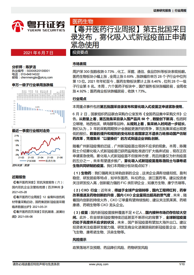 医药行业周报:第五批国采目录发布,雾化吸入式新冠疫苗正申请紧急使用