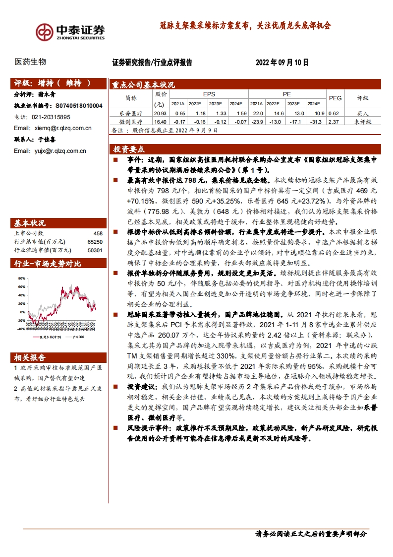 2022-09-13-中泰证券--医药生物:冠脉支架集采续标方案发布,关注优质龙头底部机会