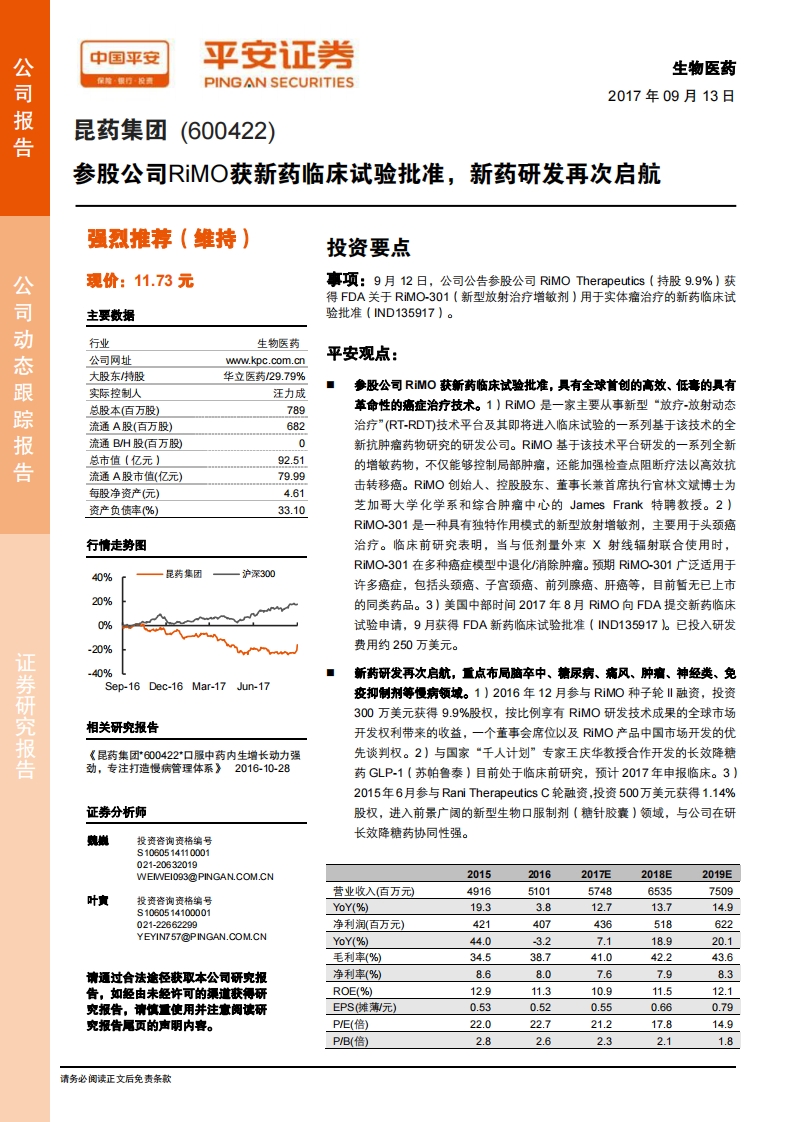 2017-09-13-平安证券-昆药集团-参股公司RiMO获新药临床试验批准,新药研发再次启航