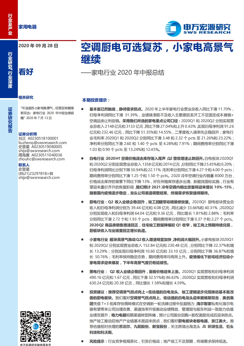 家电行业2020年中报总结:空调厨电可选复苏,小家电高景气继续