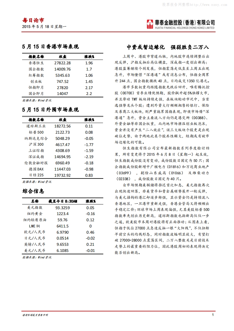 20150608-华泰证券:-华泰金融香港-每日论市-中资或暂边缘化,强弱胜负二万八-3页