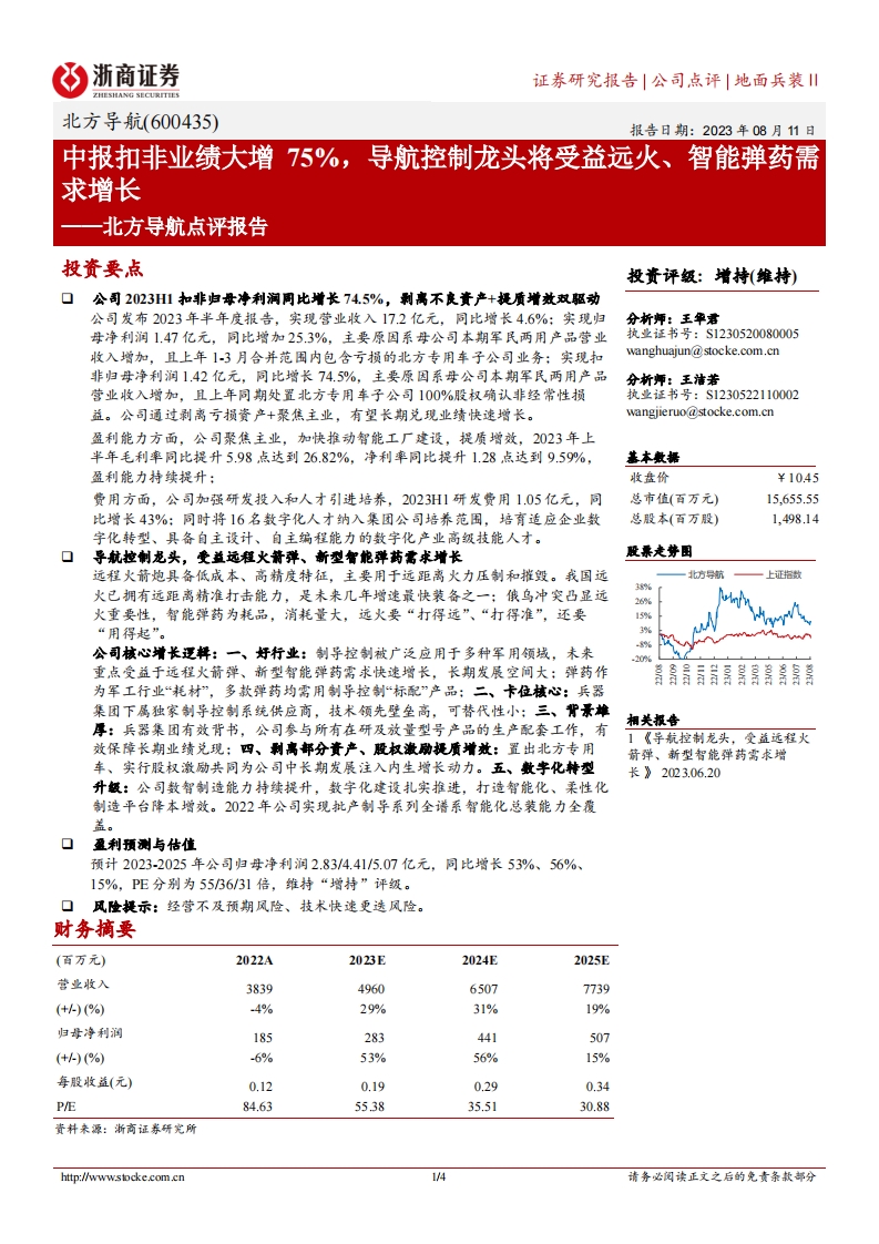 2023-08-13-浙商证券-北方导航-北方导航点评报告:中报扣非业绩大增75%,导航控制龙头将受益远火、智能弹药需求增长