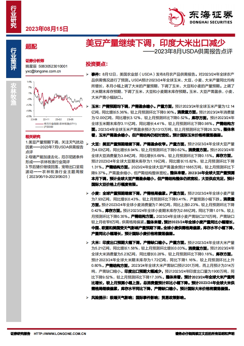 2023-08-15-东海证券--2023年8月USDA供需报告点评:美豆产量继续下调,印度大米出口减少