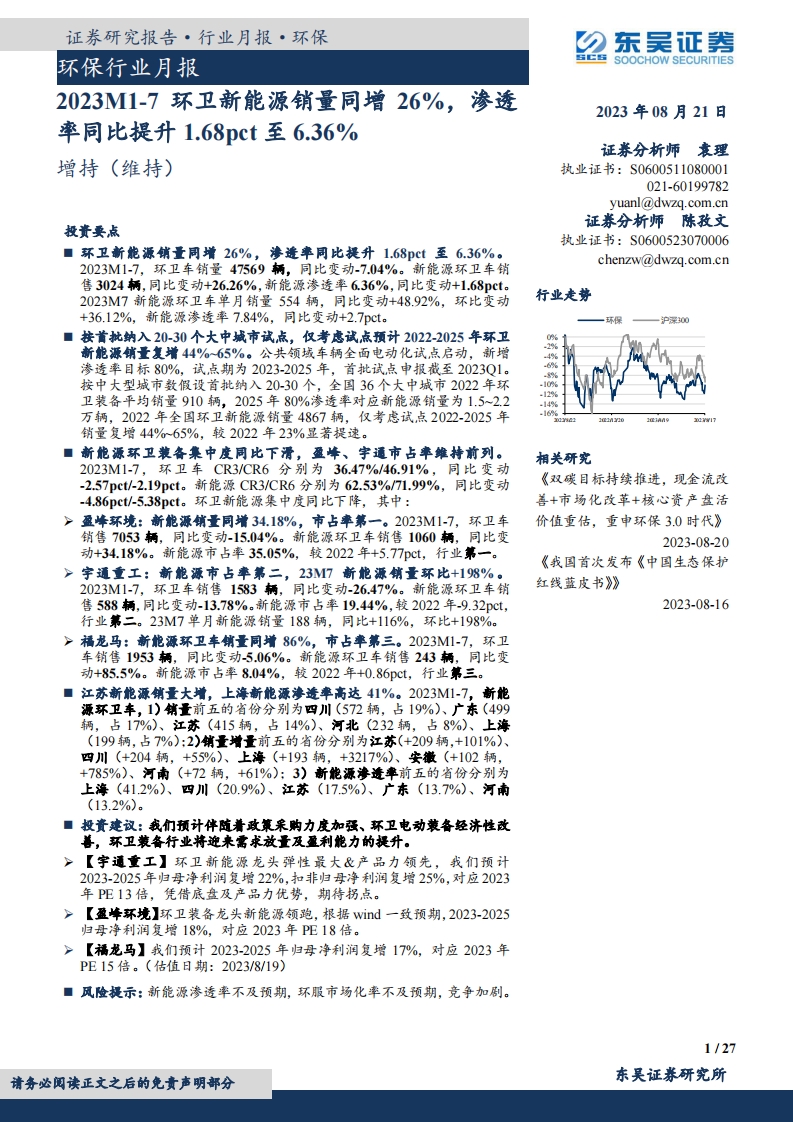 2023-08-21-东吴证券-环保行业月报:2023M1-7环卫新能源销量同增26%,渗透率同比提升1.68pct至6.36%