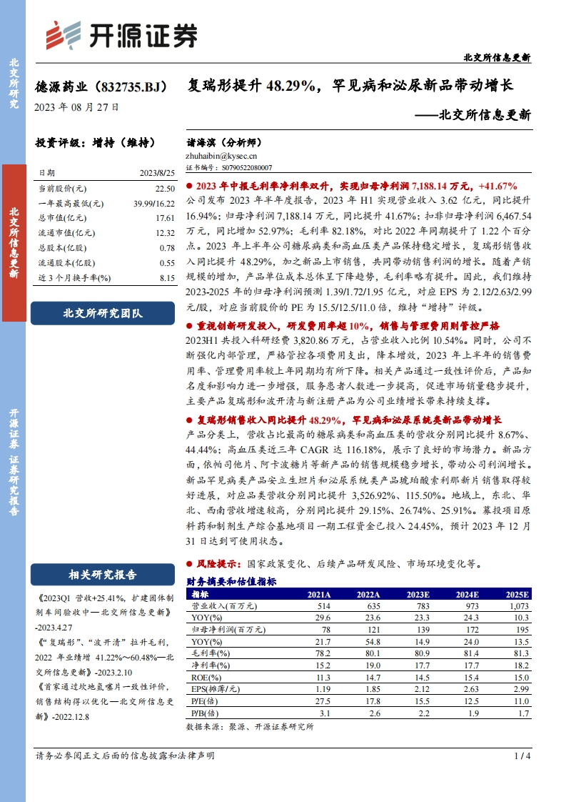 2023-08-28-开源证券-德源药业-北交所信息更新:复瑞彤提升48.29%,罕见病和泌尿新品带动增长
