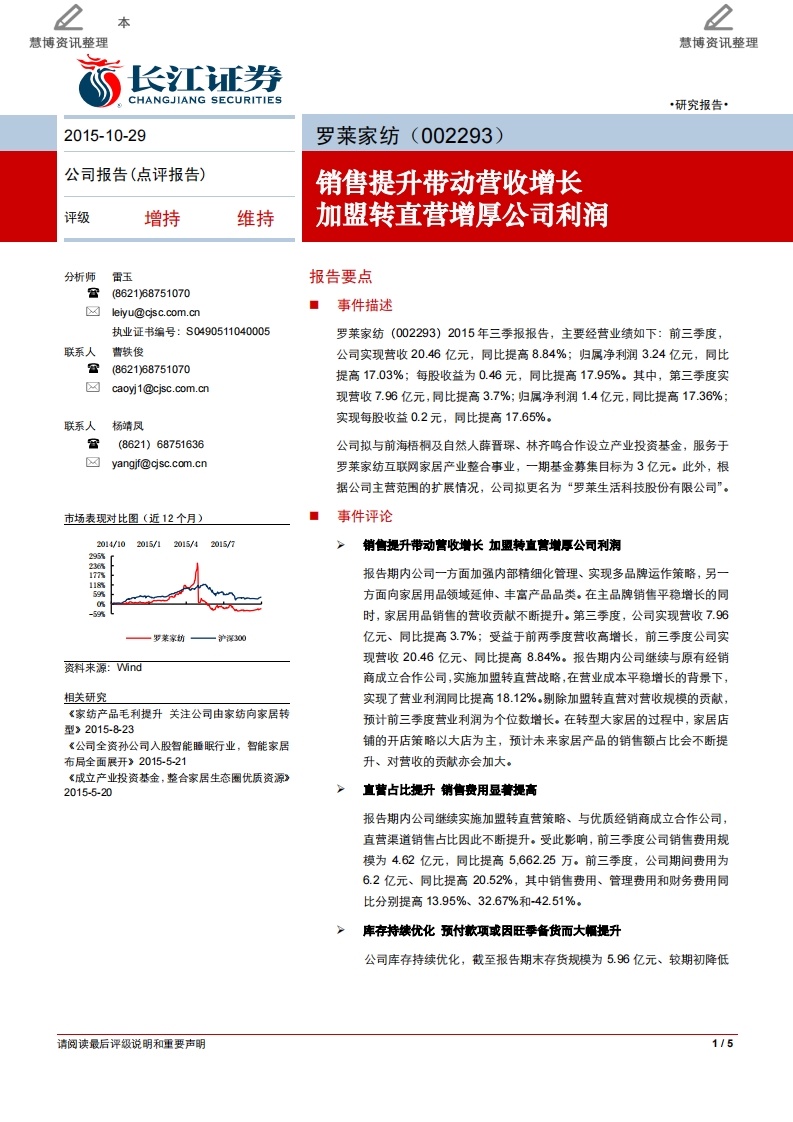 20151029-长江证券:罗莱家纺-销售提升带动营收增长,加盟转直营增厚公司利润-5页
