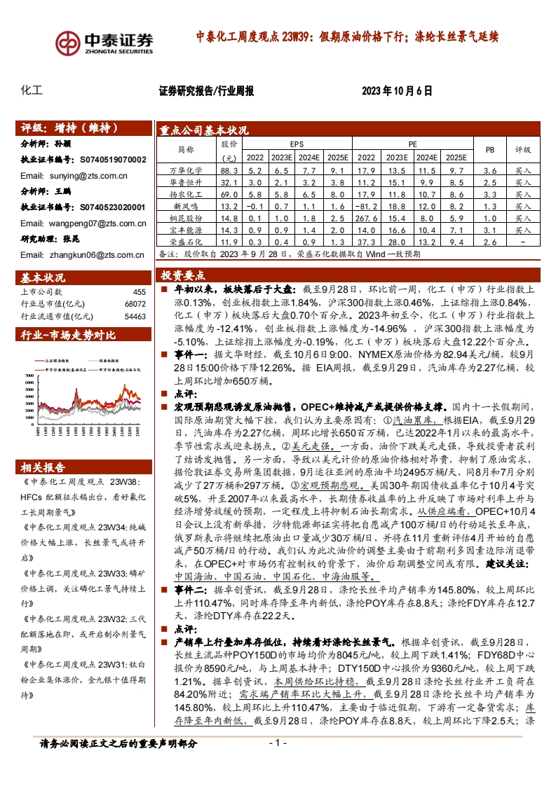 2023-10-07-中泰证券-中泰化工周度观点23W39:假期原油价格下行;涤纶长丝景气延续