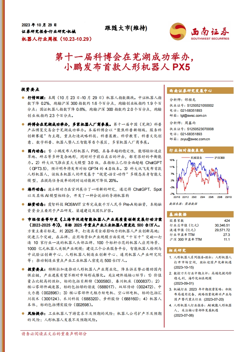 2023-10-31-西南证券--机器人行业周报:第十一届科博会在芜湖成功举办,小鹏发布首款人形机器人PX5