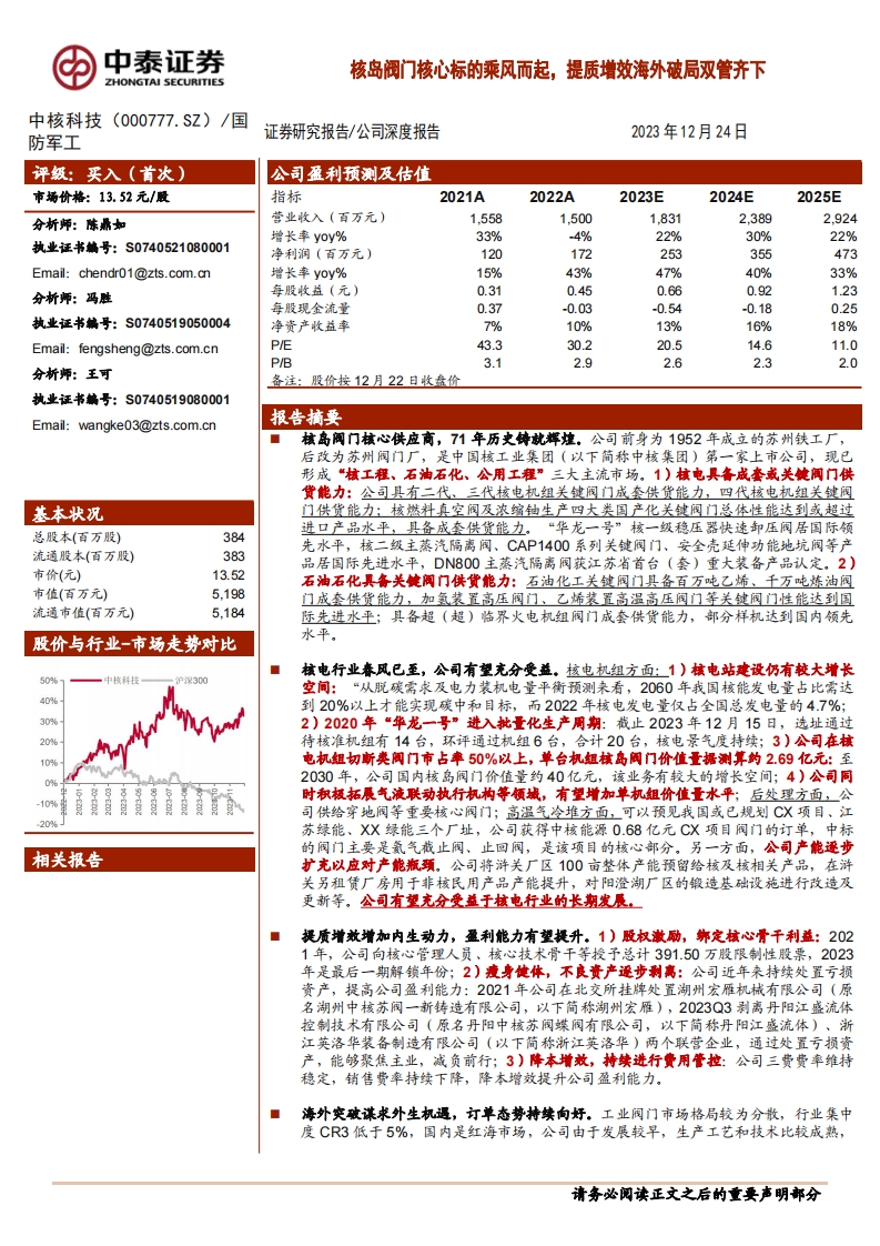 2023-12-25-中泰证券-中核科技-核岛阀门核心标的乘风而起,提质增效海外破局双管齐下