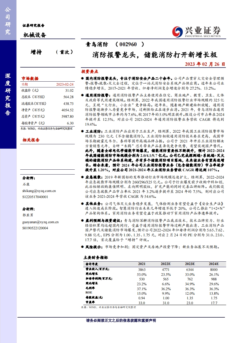 兴业证券-青鸟消防(002960)消防报警龙头,储能消防打开新增长极-230226