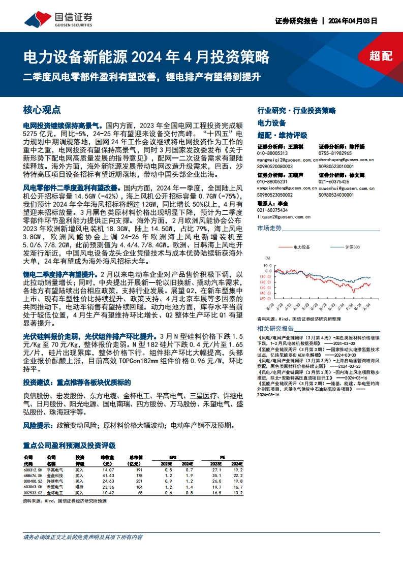 2024-04-03-国信证券--电力设备新能源2024年4月投资策略:二季度风电零部件盈利有望改善,锂电排产有望得到提升