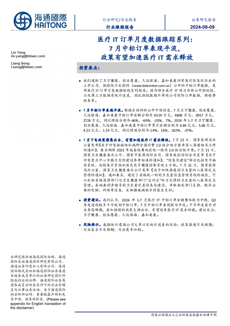 2024-08-11-海通国际--医疗IT订单月度数据跟踪系列:7月中标订单表现平淡,政策有望加速医疗IT需求释放