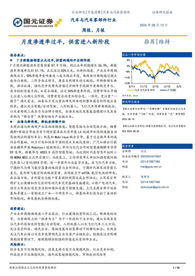 2024-08-13-国元证券--汽车与汽车零部件行业周报、月报:月度渗透率过半,供需均进入新阶段
