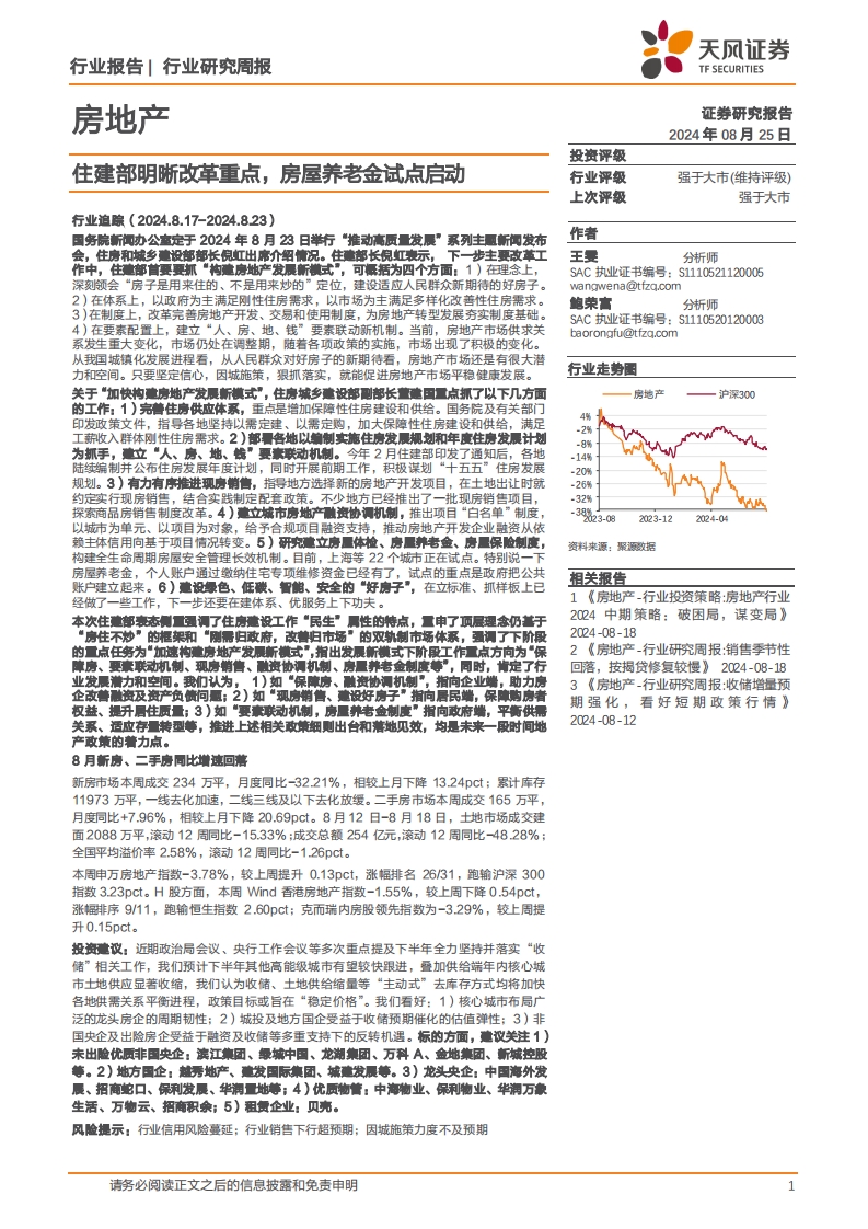 2024-08-25-天风证券--房地产行业研究周报:住建部明晰改革重点,房屋养老金试点启动