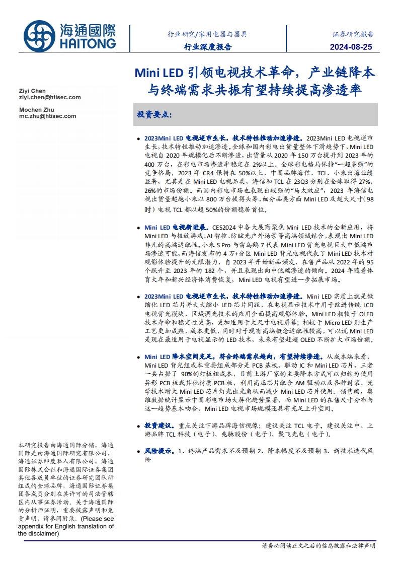 海通国际:家用电器与器具行业深度报告-Mini LED引领电视技术革命-产业链降本与终端需求共振有望持续提高渗透率