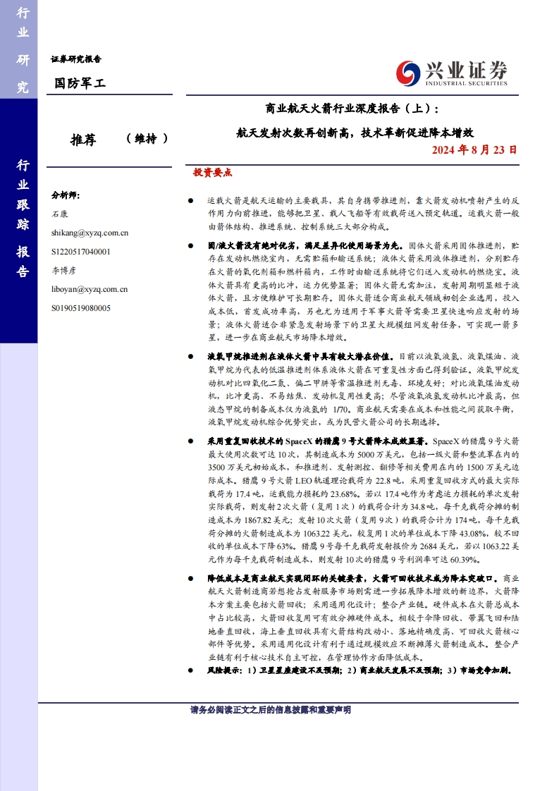 商业航天火箭行业深度报告(上):航天发射次数再创新高,技术革新促进降本增效
