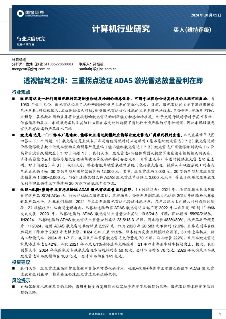 2024-10-09-国金证券--计算机行业研究:透视智驾之眼:三重拐点验证ADAS激光雷达放量盈利在即