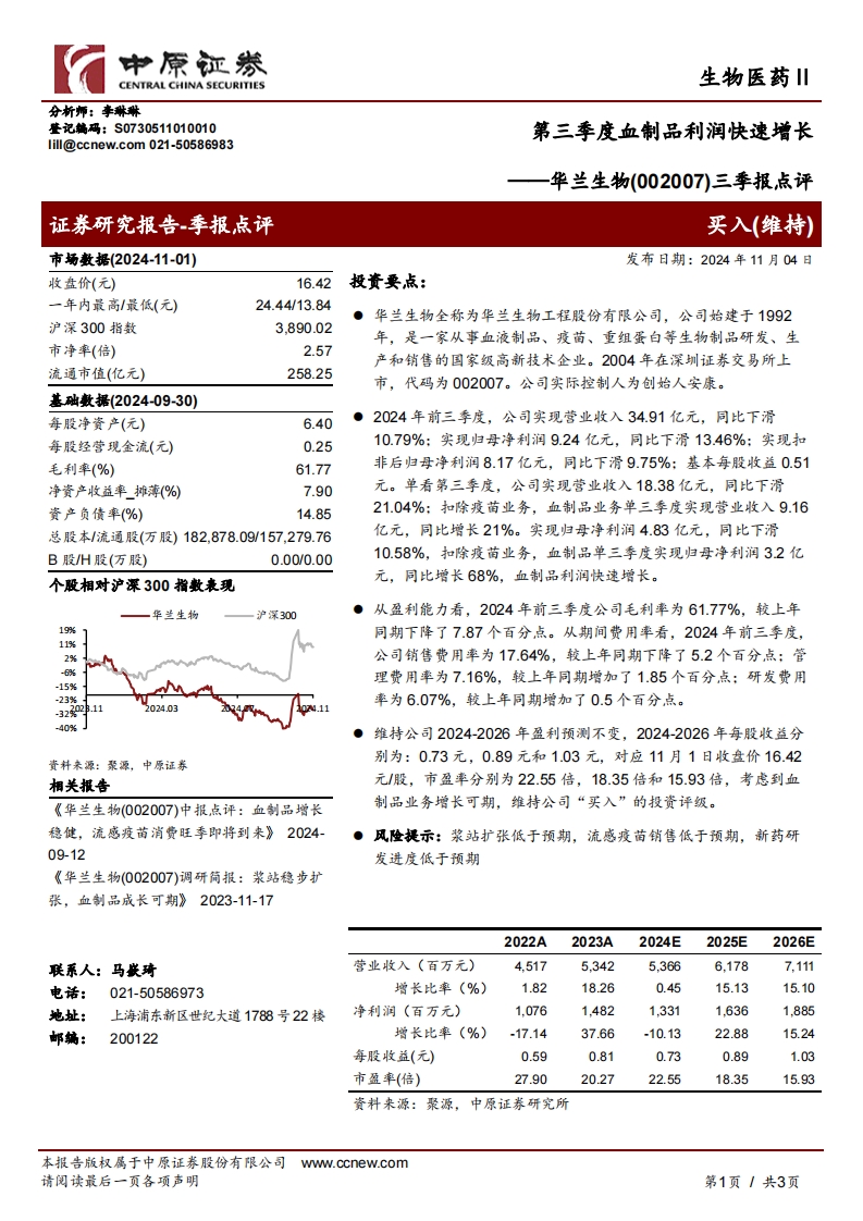 2024-11-04-中原证券-华兰生物-三季报点评:第三季度血制品利润快速增长