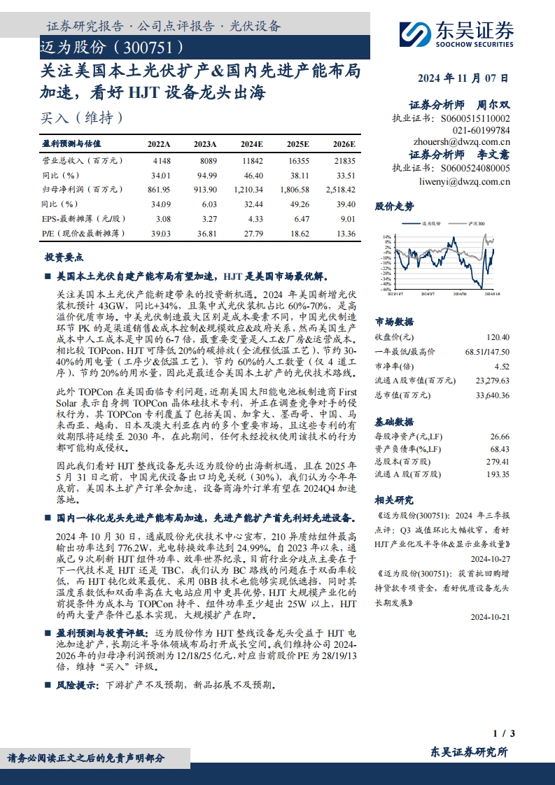 2024-11-07-东吴证券-迈为股份-关注美国本土光伏扩产&国内先进产能布局加速,看好HJT设备龙头出海
