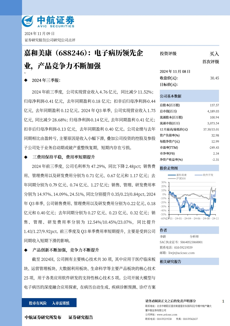 2024-11-13-中航证券-嘉和美康-电子病历领先企业,产品竞争力不断加强