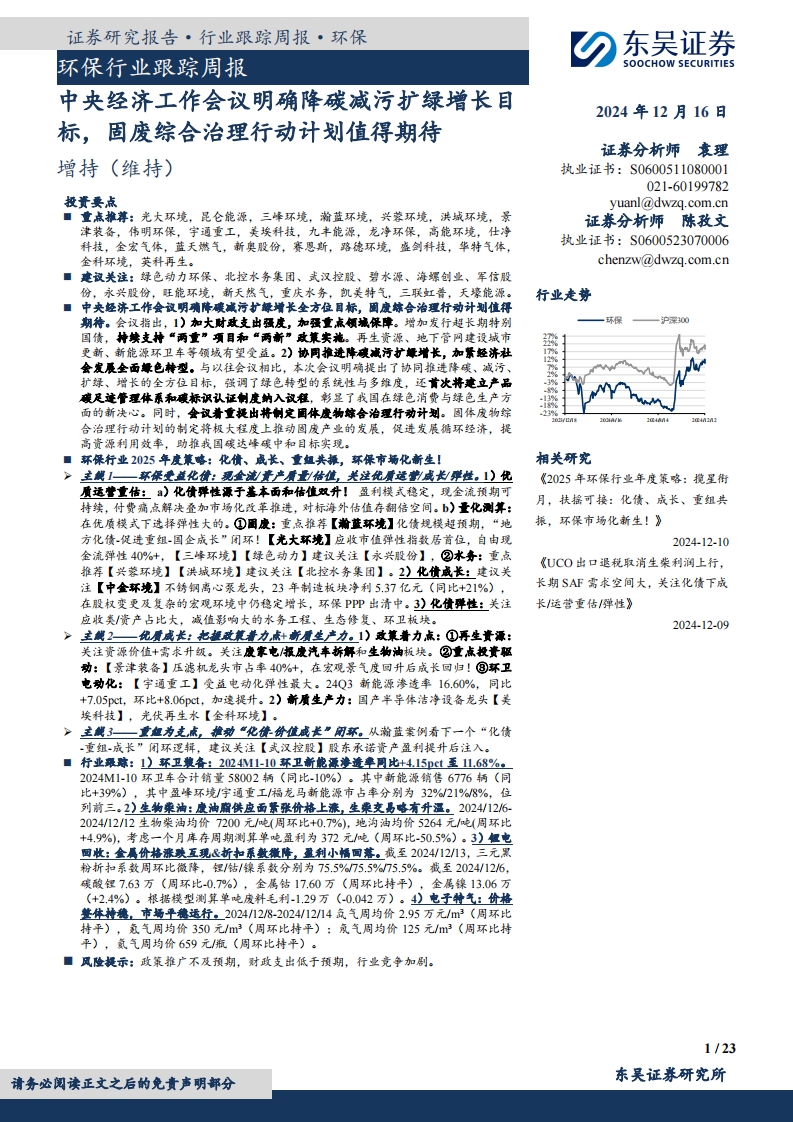 2024-12-16-东吴证券--环保行业跟踪周报:中央经济工作会议明确降碳减污扩绿增长目标,固废综合治理行动计划值得期待