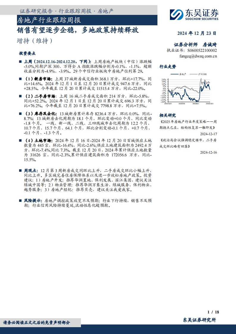 2024-12-23-东吴证券--房地产行业跟踪周报:销售有望逐步企稳,多地政策持续释放