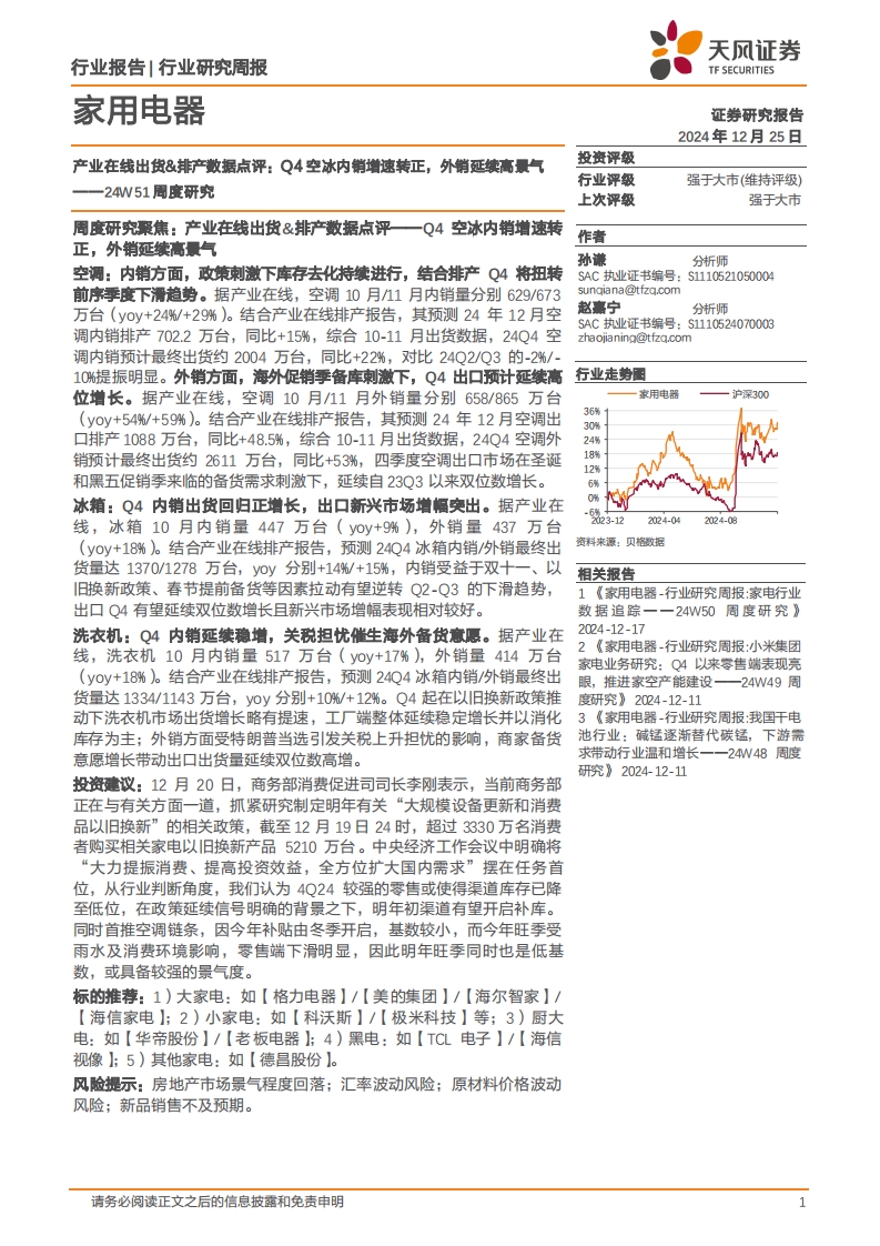 2024-12-25-天风证券--家用电器行业24W51周度研究:产业在线出货&排产数据点评,Q4空冰内销增速转正,外销延续高景气