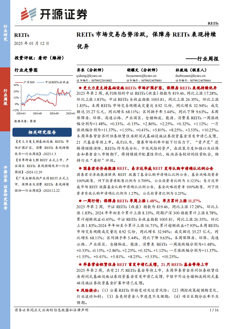 2025-01-13-开源证券--REITs行业周报:REITs市场交易态势活跃,保障房REITs表现持续优异