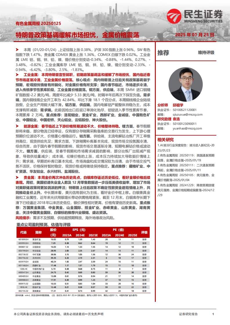 2025-01-26-民生证券--有色金属周报:特朗普政策基调缓解市场担忧,金属价格震荡