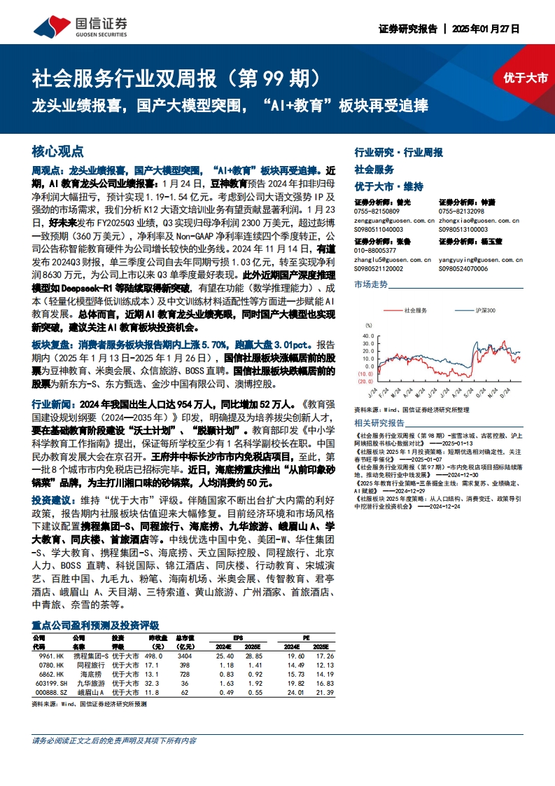 2025-02-01-国信证券--社会服务行业双周报(第99期):龙头业绩报喜,国产大模型突围,“AI+教育”板块再受追捧