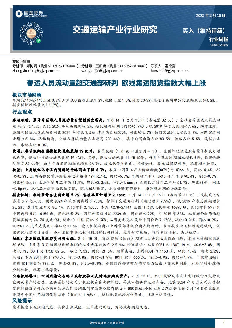 2025-02-16-国金证券--交通运输产业行业周报:春运人员流动量超交通部研判,欧线集运期货指数大幅上涨